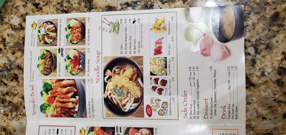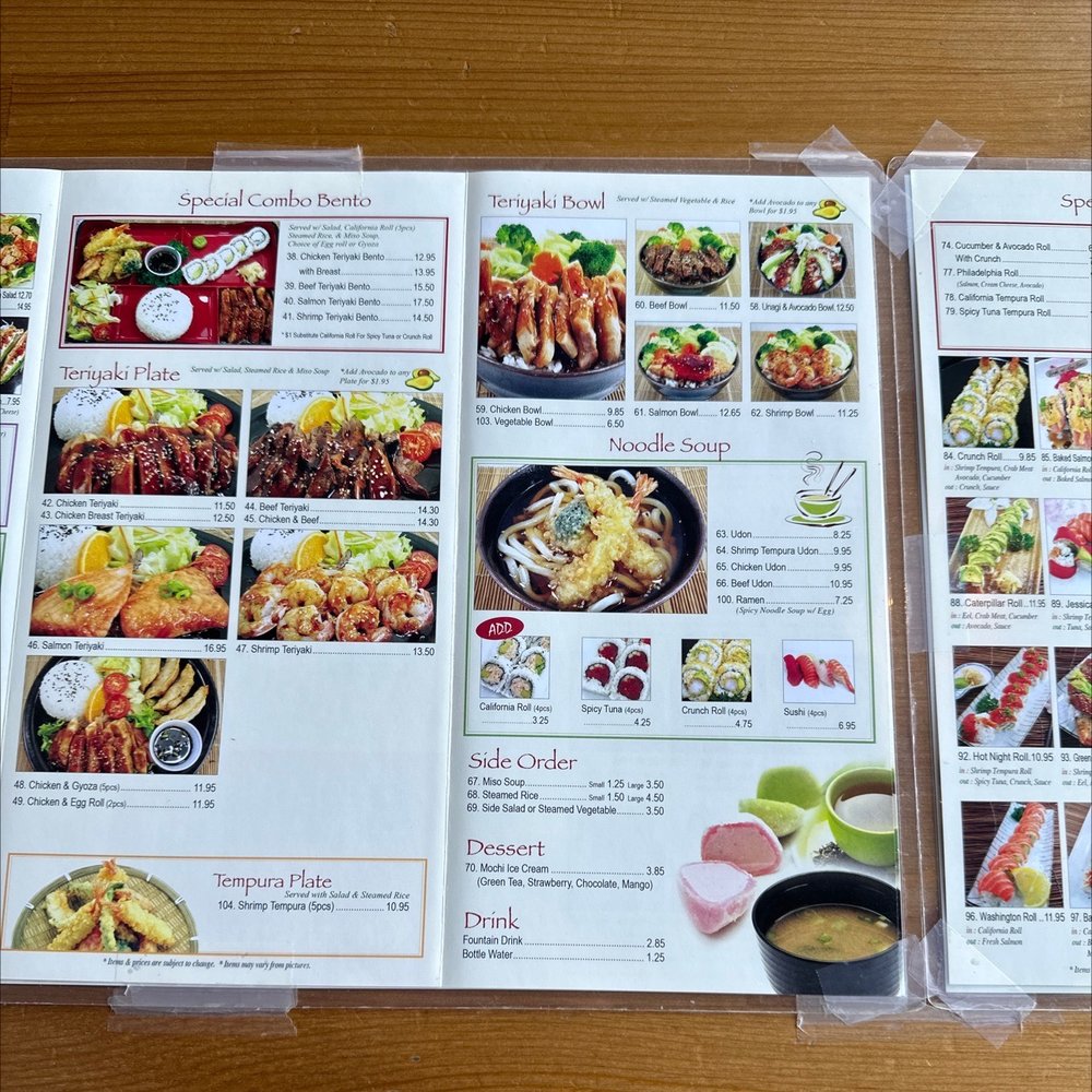 Juicy chicken bento with choice of egg rolls, gyozas, or veggie tempura. Includes a variety of sushi rolls like California roll, spicy tuna roll, and more.